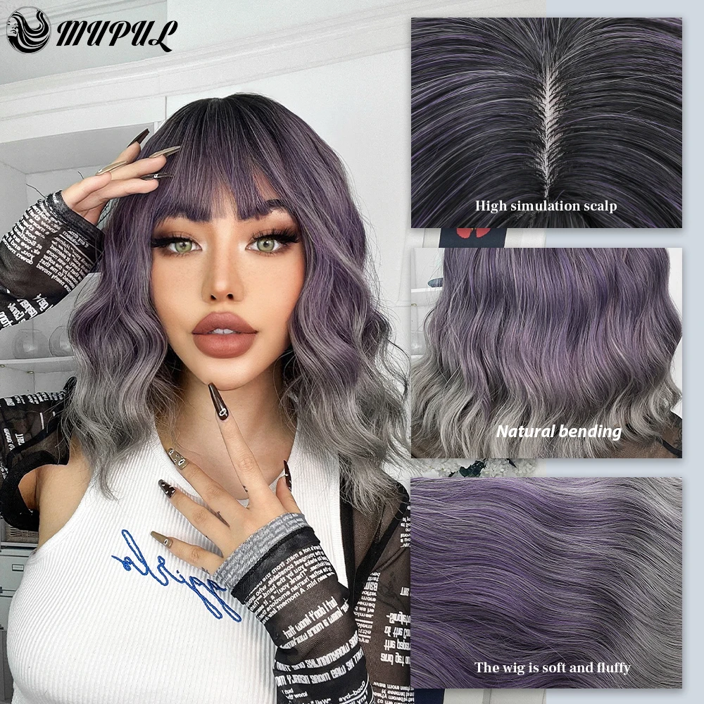 Short Wavy Purple Ombre Gray Hair Natural Synthetic Wigs For Women With Bangs Natural Heat Resistant Cosplay Wavy Fibre Wig Aliexpress